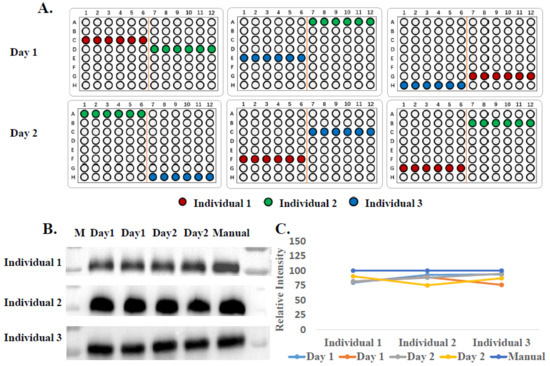 Stability assessment of the automated isolation. (A) The random sampling position sketch map of sample processing over two days. (B) Western blot analysis of CD9 signal from isolated EVs in urine. (C) Western blot CD9 quantitation from B.