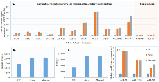 To evaluate another major component in EVs, miRNA, after capture with the above three processes (UC, manual and automation), we focused on several common EV miRNAs species previously reported by other groups, miR-21, miR-125b and miR-221. MiR-21 has attracted the attention of researchers in various fields, such as development, oncology, stem cell biology and aging, becoming one of the most studied miRNAs [35]. MiR-125b was implicated to have close relationship with cell proliferation and differentiation, and downregulation of miR-125b was observed in various types of cancers [36]. MiR-221, located on human chromosome X, is upregulated in many different cancers. As an oncomiR or oncosuppressor-miR, MiR-221 plays an important role in tumor progression [37]. As shown in Figure 4D, the miRNA levels obtained through automated and manual extraction were similar. However, for all three miRNAs analyzed, the miRNA amounts after automated capture were 7-, 5- and 2-fold higher than using the ultracentrifugation method, respectively, indicating the superior performance of the EVrich method.