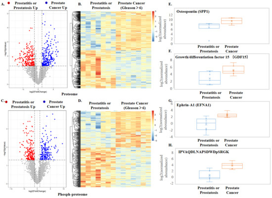 In total, we identified 47,563 unique peptides corresponding to 4328 unique proteins (Table S4) and 8961 phosphorylated peptides representing 1606 unique phosphoproteins (Table S5). Principle component analysis (PCA) on the EV proteins and phosphoproteins clearly separated the cancer groups from the control group (Figure S5). Further, in-depth data analysis was employed to obtain statistical results and generate volcano plots and visualized heatmaps (Figure 5A–D). In comparison to prostatitis or prostatosis samples, the prostate cancer groups identified 268 overexpressed proteins and 186 overexpressed phosphorylated peptides corresponding to 48 phosphoproteins, which were illustrated in the volcano plots (Figure 5A,C). The proteins and phosphopeptides included in the two heatmaps were listed in Tables S6 and S7. We enriched the differential proteins to 25 biological processes (p-value < 0.05), among which the biological process of cell adhesion, a process highly relevant to cancer invasion and metastasis, had the most enriched proteins and the highest confidence (Figure S6). Among the pathways enriched by differential proteins, the PI3K—Akt signaling pathway, which is associated with cancer, had the more identified proteins and higher confidence [44]. In addition, the confidence of the cell adhesion molecule pathway is also very high [45] (Figure S7). Among upregulated phosphoproteins, at least 14 of them have been previously reported to associate with prostate cancer: PLAU, SPP1, MCAM, CDH11, GDF15, IGSF8, CRISP3, LGALS3, FGFR1, HYAL1, and ENG. Our discovery of these proteins in urine EVs is quite appealing as these prostate cancer-related proteins were previously discovered in cell systems or animal models. Full validation of all these proteins will be beyond the scope of this study, and here we exemplify three proteins and one phosphoprotein (through quantification of its phosphopeptide) as potential biomarkers (Figure 5E–H). Previous studies indicated that secreted phosphoprotein 1 (SPP1) was involved in the recurrence and metastasis of prostate cancer [46] and regarded as a potential biomarker and therapeutic target for metastatic castration-resistant prostate cancer (mCRPC) [47]. Meanwhile, it had been shown that phosphorylated SPP1 secreted from cancer cells regulated cancer cell motility in human lung cancer [48]. In our data, we also found significant upregulation of SPP1 in the prostate cancer group (Figure 5E), and phosphorylation levels of SPP1 at 219 sites in the prostate cancer group were significantly higher than that in controls (Figure 5H). Importantly, a much larger difference in phosphorylated peptide at position 219 of SPP1 than in SPP1 quantitation indicates that up-regulation of SPP1 phosphorylation on position S219 in cancer patients is not only due to changes in SPP1 expression but also due to actual increase in phosphorylation on the specific site. Similarly, we observed that growth/differentiation factor-15 (GDF15) was highly expressed in EVs of the prostate cancer group (Figure 5F), which correlates with a previous study concluding that GDF15 can promote AR-positive prostate cancer cell proliferation through activating the ERK1/ERK2 signal pathway [49]. Finally, we found cell surface receptor protein ephrin A1 (EFNA1) is higher in prostate cancer EV than in the control group (Figure 5G). EFNA1 has been shown to be commonly overexpressed in malignant melanocytes and in prostate carcinoma cells (Figure 5G) [50]. Additional linear box-and-whiskers plots for other potential candidates are shown in Figure S5.