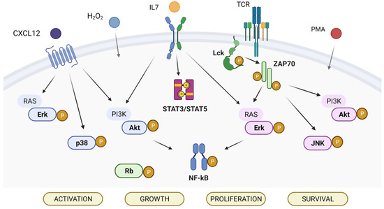 Immunophenotyping allows the classification of T-ALL in different subgroups based on the corresponding stage of T-cell ontogenesis [7]. The prognostic value of different immunophenotypic groups differs between the studies, also in the case of early T-cell precursor ALL (ETP-ALL), which is a very unique subgroup in T-ALL [8,9,10]. At the molecular level, T-ALL is a heterogenous disease characterized by a wide spectrum of genetic lesions [11] as well as by altered interpretation of external cues deriving from the microenvironment [6]. Both cell-intrinsic defects and microenvironmental stimuli converge on the activation of regulatory signaling pathways involved in processes enhancing the capacity of self-renewal, overturning the control of cell proliferation, blocking differentiation, and promoting resistance to apoptosis. Signaling pathways that are aberrantly activated in T-ALL include phosphatidylinositol-3OH-kinase (PI3K)/Akt, mitogen-activated protein kinases (MAPKs), and Janus kinases/signal transducer activator of transcription Jak/STAT [12,13]. These signaling pathways can be activated due to genetic alterations of their components as well as in response to external microenvironmental cues. Amongst cell-extrinsic modulators, the chemokine CXCL12 and interleukin 7 (IL7) play a key role in promoting tumor growth [14,15,16,17,18].