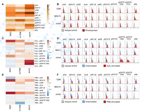 Phosphorylation profiles of T-ALL cell lines. (A,B) Pseudocolor heatmap (A) and flow cytometry histograms (B) of all the analyzed phospho-proteins in basal condition (unstimulated) in T-ALL cell lines. (C,D) Pseudocolor heatmap (C) and flow cytometry histograms (D) of the phosphorylation profiles following modulation with 3.3 mM H2O2 for 15 min. (E,F) Pseudocolor heatmap (E) and flow cytometry histograms (F) of the phosphorylation profiles following modulation with 400 nM PMA for 15 min. Data are representative of three independent experiments.