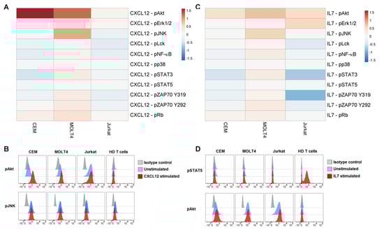 Phosphorylation profiles following modulation with CXCL12 or IL7. (A) Pseudocolor heatmap of the phosphorylation profiles following modulation with 100 ng/mL CXCL12 for 15 min. (B) Flow cytometry histograms of pAkt and pJNK in basal condition (unstimulated) or after CXCL12 modulation in T-ALL cell lines and T cells from HDs, compared with isotype signals. (C) Pseudocolor heatmap of the phosphorylation profiles following modulation with 10 ng/mL IL7 for 15 min. (D) Flow cytometry histograms of pSTAT5 and pAkt in basal condition (unstimulated) or after IL7 modulation in T-ALL cell lines and T cells from HDs, compared with isotype signals. Data are representative of three independent experiments.