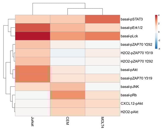 Basal phosphorylation statuses of signaling proteins—measured as log2 RMFI—and responses to external stimuli—measured by the log2Fold change in phosphorylation between modulated and unmodulated conditions—were subjected to unsupervised hierarchical clustering analysis (HCA) within the three T-ALL cell populations. Unsupervised HCA of all the analyzed nodes (n = 55) identified CEM/MOLT4 cells and Jurkat as separate clusters (Supplementary Figure S2). To reduce the number of nodes that can discriminate T-ALL cell populations, next we performed an unsupervised HCA on selected nodes showing the greatest variation across samples (σ2 of log2 values > 0.5, n = 12). Remarkably, this clustering preserved the classification obtained analyzing all nodes and allowed us to identify significant nodes characterizing the different T-ALL cell lines (Figure 4). Specifically, Jurkat cells showed higher phosphorylation of basal-pErk1/2, basal-pLck, basal-pAkt, basal- and H2O2-induced pZAP70 nodes. CEM cells were characterized by increased basal pJNK and pRb, and Akt induced by CXCL12 and H2O2. MOLT4 cells exhibited higher STAT3 phosphorylation in the basal condition (Figure 4). These nodes were particularly important for T-cell classification since the clustering of T-ALL cell lines was lost if they were excluded from analysis (Supplementary Figure S3).