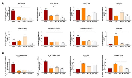 Results from independent experiments showed an overall consistency of basal and induced phosphorylation measurements among experiments. Interestingly, comparison of these data across T-ALL and HD T cells showed that Jurkat significantly contrasted HD T cells by high levels of basal-pAkt, basal-pERK1/2, basal-pZAP70Y319, and basal-pZAP70Y292 (Figure 5A). Moreover, H2O2 -induced pZAP70Y292 was significantly higher in Jurkat when compared with CEM (Figure 5B). Compared with normal T cells, pRb in the basal condition and CXCL12-induced pAkt were significantly higher in CEM (Figure 5). In addition, pAkt induced by H2O2 was significantly higher in CEM when compared with Jurkat cells (Figure 5B).