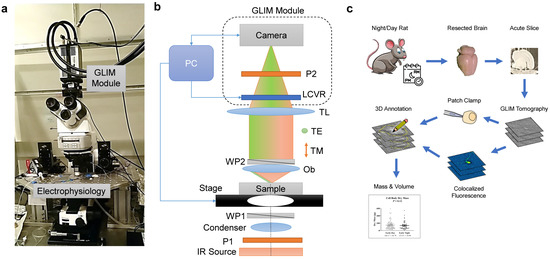 Figure 1. Gradient light interference microscopy and electrophysiology system to characterize acute brain slices. (a) Compact GLIM module attached to a motorized microscope equipped with infrared DIC illumination and electrophysiology patch-clamp system. (b) Interferometric imaging system. An IR source is uniformly illuminating the sample via a polarized condenser. The Wollaston prism WP1 splits the unpolarized light into TE and TM polarizations, which are slightly shifted at the sample plane. The light scattered from the sample passes through the WP2 such that the two beams are now recombined. The tube lens (TL) forms a magnified image at the camera plane. Before reaching the detector, the liquid crystal variable retarder (LCVR) modulates the phase of one polarization with respect to the other. An output polarizer (P2) projects the orthogonal polarizations to the same direction such that they interfere at the camera plane. A personal computer (PC) synchronizes precisely the LVCR modulation with camera acquisition and stage position. (c) GLIM was used to study circadian changes in astrocyte dry mass and morphology. Acute brain slices were harvested from rats during the day or night portion of the cycle. GLIM tomography was performed followed by patch clamp and fluorescence confirmation of astrocytes. Data were annotated using a 3D software tool developed in-house.