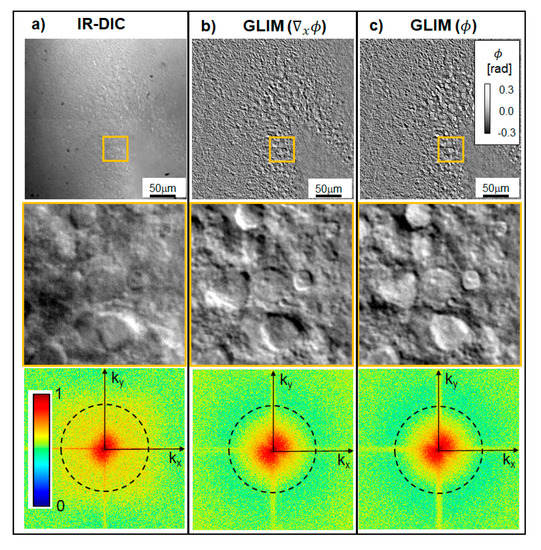 The boost in contrast that GLIM brings over regular DIC is shown in Figure 2. It can be seen in DIC that the contrast is reduced due to multiple scattering, such that the apex of the DG is hardly visible (Figure 2a). GLIM, on the other hand, significantly reduces artifacts due to multiple scattering. Since the incoherent background is unaffected by LCVR modulation, the background introduces a common offset to the DIC intensity images and is eliminated during phase-retrieval (Equation (3), pair of frame subtractions). Interestingly, strong scattering affects not only the contrast but also the resolution. Of course, the NA of the imaging system is the same for both DIC and GLIM, which, under diffraction-limited conditions, means that the resolution should be the same. However, the scattering background noise affects the spatial high-frequency components of the DIC much more strongly than GLIM, as evidenced by the power spectra in Figure 2. As a result, the fine details in the DIC images are lost in the noise.