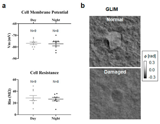 Figure 4. Astrocytes during the circadian cycle are indistinguishable by electrophysiology. (a) Comparison of day vs. night cells shows no statistically significant difference in membrane potential and resistance values. (b) GLIM reports different phase maps for normal and damaged cells (63×/1.0NA objective).