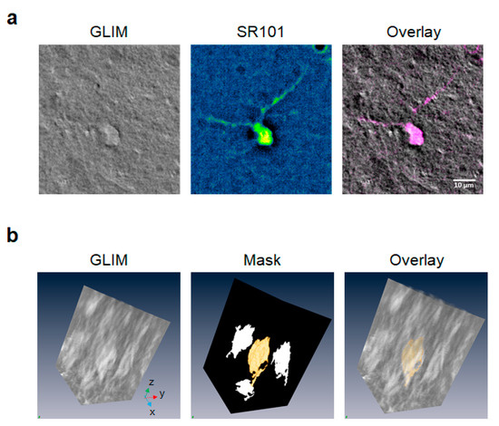 Figure 5. Sulforhodamine 101 enables identification of cells imaged by GLIM as astrocytes. (a) Live brain slices were incubated in ACSF containing 1 µm Sulforhodamine 101 (SR101). SR101-positive astrocytes were identified using fluorescent microscopy and z-stack images of the region of interest were acquired (63×/1.0NA objective). The colocalization of the fluorescent and GLIM images of the same ROI was used to obtain 3D measurements, including cell volume and dry mass. (b) Dry mass maps were obtained by a coarse annotation of the GLIM volume, followed by computational, threshold-based refining of the course map. The resulting segmentation masks obtained from fluorescence were used on the GLIM channel to extract the dry mass and cellular volume.