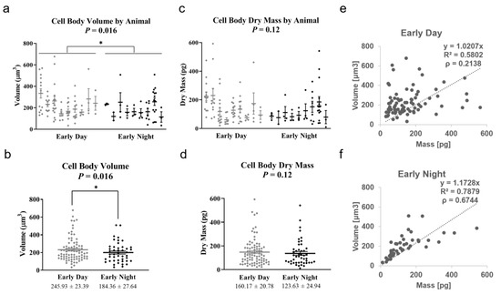 Figure 6. Astrocyte cell bodies display significantly larger volume during the day vs. night time. (a) Distribution of cell body volumes, with cells for individual animals shown as points on separate vertical lines. * p < 0.05 (b) Cell volume distribution obtained by combining measurements from all animals. The volume distributions for day vs. night show statistical significance. * p < 0.05 (c) Distribution of cell dry mass values, with cells for individual animals shown as points on separate vertical lines. (d) Cell dry mass distribution obtained by combining measurements from all animals. The dry mass distributions for day vs. night show no statistical significance. n = 9 animals per time point (total of 129 cells). Error bars represent standard error of the mean (SEM). (e,f) show that the correlation between dry mass and volume is more pronounced during the early night (f).