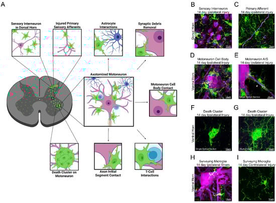 Peripheral nerve injury (PNI) results in an extensive immune reaction within the spinal cord. Ipsilateral to the injury, microglia, the native macrophage of the central nervous system (CNS), proliferate and undergo phenotypic changes that result in the release of pro- and anti-inflammatory cytokines and a variety of interactions with different spinal cellular elements. This immune reaction displays different intensities at specific locations in the dorsal and ventral horns. In the superficial lamina of the dorsal horn (lamina I to III (LI–LIII)), where the central projections of injured nociceptor afferents are localized, the immune reaction is very strong [,]. The microglia reaction is less extensive in deeper dorsal horn laminae. Finally, the ventral horn contains the cell bodies and proximal dendrites of axotomized motoneurons (MNs), as well as the central projections of peripherally injured proprioceptive sensory afferents [,,]. Overall, most microglia throughout the ipsilateral ventral horn show morphologies suggesting activation, but their density and markers of activation are greatest around injured motoneurons in LIX. Injured proprioceptive afferents also travel in the medial deep dorsal horn (LV), where there is also a significant microglia reaction.
