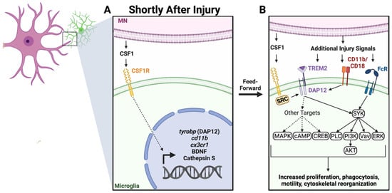One further possibility is the activation of receptors that converge in the same pathway downstream of CSF1-Rs. CSF1-R acts through DNAX activating protein of 12kDa (DAP12), the immunoreceptor tyrosine-based activation motifs (ITAMs), and Spleen associated Tyrosine Kinase (SYK). DAP12/ITAM/SYK activates protein kinase B (AKT), cAMP response element-binding protein (CREB), phospholipase C (PLC), Vav, and mitogen-activated protein kinase (MAPK) [,,,]. These signaling cascades influence microglia proliferation, migration, the release of cytokines, and modulate neuroinflammation and phagocytosis. DAP12/ITAM/SYK is a signaling hub shared by several surface receptors involved in microglia activation [,]. Triggering receptors expressed on myeloid cells-2 (TREM2), complement 3 receptors (CD11b/CD18), and some types of Fc receptors all converge in these same pathways []. All are upregulated in microglia after PNI. For example, TREM2 upregulation after PNI increases DAP12 phosphorylation, and blocking this mechanism reduces hyperalgesia []. CD11b, and more specifically the rat-specific monoclonal antibody that recognizes this surface antigen (OX-42) has been widely used to identify activated microglia in the spinal cord after a variety of nerve injuries []. Finally, it has also been known for some time that microglia surrounding axotomized MNs accumulate immunoglobulin G by Fc receptor binding []. A recent “micro-report” suggests Fc gamma receptor 1 (FcgRI) is also upregulated in the dorsal horn and participates in nerve-injury-induced chronic pain []. These less explored signals could contribute to microglial activation and/or modulate its properties, perhaps resulting in different behaviors and functions over different cellular elements of the dorsal or ventral horn. The ligands that activate these receptors include stress or “eat me” signals, such as phosphatidylserine for TREM2, opsonization through the classical complement pathway for C3Rs, and IgG and complement surface molecules for Fc receptors. The coordination and integration of these various signals during the diverse spinal microglia response to peripheral nerve injuries are currently unexplored. However, it is interesting that intrathecal CSF1 also regulates the expression of tyrobp, the gene encoding DAP12 [], suggesting a feed-forward potentiating mechanism. In conclusion, CSF1 emerged as a master upstream regulator of spinal microglia activation pathways after PNI. These can be further modulated by convergent or alternate signals summarized in Figure 2.