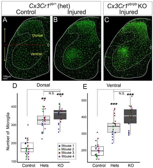 Lack of effect of CX3CR1 genetic removal in spinal cord microgliosis after sciatic nerve injury. (A–C). Low magnification confocal images showing CX3CR1-GFP microglia in a naïve spinal cord (A), 14 days after a sciatic nerve injury (B) or after the same injury in a homozygote CX3CR1 knockout mouse (C). The boundaries used to delimit dorsal and ventral horns are indicated by a red dash line drawn from the top of the central canal. (D,E). Quantification of microglia in dorsal and ventral horns of 50 µm thick sections of Lumbar 5. Four animals were analyzed for each phenotype. The number of microglia was automatically counted using the spot function in Imaris in five to seven sections per animal. Boxplots indicate the median (thick line), the box represents the 25th (Q1) and 75th (Q3) quartiles, and the whiskers represent the min (−1.5* Q1) and max (1.5* Q3). Each dot is a section color-coded for each animal. Following sciatic injury there is a significant increase in microglia in both dorsal and ventral horns of heterozygotes (Hets) and knockout (KO) mice. Pair-wise comparisons showed that Hets and KOs were significantly different to controls in both dorsal and ventral horns, but there was no statistical difference between them. For statistics, we used linear mixed-effect models (lme4 and emmeans packages) in R to account for variability between animals (shown by color segregation in each genotype). ** p < 0.001, *** p < 0.0001.