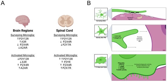 It is unknown if similar P2Y12R junctions are found at points of interaction between microglia and MNs, but there are intriguing parallels between the described interactions of microglia with cortical neurons mediated by P2Y12Rs and two-photon visualization of microglia dynamics on intact and axotomized MNs. Transient contacts on the cell body surface of intact MNs transition after axotomy to frequent interactions, sometimes micro-phagocytic, and finally to a more permanent surface covering []. Moreover, KV2.1 is known to de-cluster in MNs after axotomy [], a process that was also correlated with microglia wrapping in the cortex. Once the MN is surrounded by microglia processes, primary processes become stable and less dynamic but extend multiple filopodia. A recent report showed that filopodia-mediated surveillance is associated with decreased P2Y12R signaling and increased cAMP inside filopodia []. In addition, the UDP-activated Gq/11 P2Y6R is also upregulated around axotomized MNs []. P2Y6R can mobilize internal calcium stores through inositol triphosphate (IP3) receptors and increase phagocytic activity while reducing microglia process lengths and ramification []. In comparison to ATP/ADP signals, UDP is released by stressed or damaged neurons, suggesting a potential signal that can modify the behavior of microglia depending on the health status of the immediate MN they associate with. Finally, neuronal injury can produce excessive ATP leakage that when converted to adenosine through ectonucleotidases, such as C39, increase local adenosine concentration. Adenosine acting on A2ARs promotes process retraction and phagocytic ameboid phenotypes. A2AR expression is very low in the spinal cord, but it is upregulated with microgliosis after PNI []. Changing P2YR and AR activations can explain the variety of microglia interactions described over axotomized MNs. Figure 4 graphically illustrates differences in purinergic signaling receptors in relation to microglia location in the CNS (Figure 4A), microglia state (Figure 4B), and process versus filopodia extension (Figure 4B).