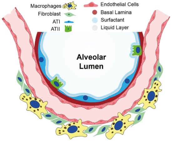 The biological processes involved in IPF onset are still a matter of considerable interest for the scientific community; however, a common consensus has been established in considering repetitive alveolar epithelial injury followed by an aberrant regenerative response as the main trigger [6]. Alveoli are lined by a continuous epithelium composed of intermixed alveolar epithelial type I (ATI) and alveolar epithelial type II (ATII) cells, and they are separated from one another by interalveolar septa. ATI cells, which represent around 40% of the alveolar cellular population and cover 90% of the alveolar surface area, are differentiated cells with a thin and flat shape with multiple branches spread over a large area of the alveolar epithelial basal lamina, facilitating contact with alveolar endothelial cells and promoting gas exchange. Instead, ATII cells, which account for about 60% of the alveolar cells and cover the remaining 10% of the alveolar surface area, are small, cuboidal cells. Their primary function is to reduce surface tension by the secretion of surfactant, mainly composed of phospholipids, such as dipalmitoylphosphatidylcholine; unsaturated phosphatidylcholine and neutral lipids; and surfactant-associated proteins, termed surfactant proteins C (SPC), B (SPB), A (SPA), and D (SPD). SPC and SPB are essential proteins for preventing alveolar collapse during the respiratory act [7]. In addition, ATII cells regulate innate immunity in the lung via secretion of collectins; SPA and SPD; and anti-inflammatory, antimicrobial mediators, such as lysozymes and defensins [7] (Figure 1). Defects of pulmonary surfactants in infants are linked with respiratory distress syndrome (ARDS) or, in adults, with acute ARDS and interstitial lung diseases [8].