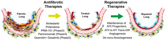For this reason, therapeutical strategies should be aimed not only at stabilizing or slowing down the disease and improving quality of life but also at reverting the disease by discovering new effective therapies that promote alveolar regeneration (Figure 4).