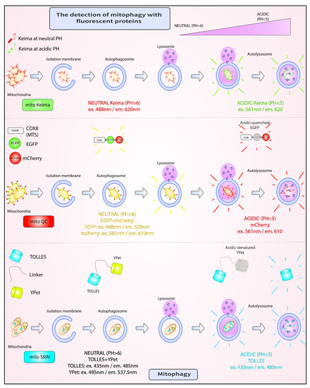 Fluorescent assays for mitophagy. A. mito-Keima is a pH-sensitive fluorescent biosensor, which fluoresces green at neutral pH in the cytosol, and red upon entry into acidic autolysosomes. B. mito-QC comprises two mitochondrially-targeted tandem fluorescent proteins, EGFP and mCherry. Both EGFP and mCherry fluoresce in the cytosol. However, in the lysosome, the fluorescence of mCherry is retained, while that of GFP is lost. C. mito-SRAI consists of two mitochondrially-targeted tandem fluorescent proteins, TOLLES and YPet. Unlike YPet, which is pH sensitive, TOLLES evades both acid-denaturation and proteolysis inside the lysosomal lumen and retains fluorescence.