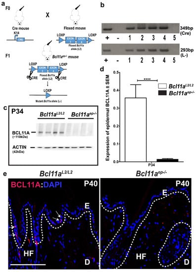 Confirmation of epidermal specific Bcl11a excision in Bcl11aep−/− mice. (a) Schematic representation of Cre-LoxP mediated generation of Bcl11aep−/− mice. (b) PCR amplification of Cre and L- (excision) alleles on tail DNA extracted from Bcl11aL2/L2 and Bcl11aep−/− mice. “+” and “−” indicates positive and negative control with PCR being performed on isolated DNA from pre-confirmed Bcl11aep−/− mice and Milli-Q water, respectively. 1,2,3,4,5 represent mouse ID numbers (either Bcl11aL2/L2 or Bcl11aep−/−) from which the tail tip was harvested for subsequent DNA extraction and PCR. (c) Immunoblot analysis of epidermal protein extracts from postnatal day 34 (P34) tail skin samples using anti-BCL11A monoclonal antibody. β-actin was used as the internal control. (d) Bar graph quantification of P34 epidermal BCL11A expression in wildtype (Bcl11aL2/L2) versus mutant (Bcl11aep−/−) mice. (e) IHC of 5-μm thick dorsal skin sections with anti-BCL11A antibody (red) in Bcl11aL2/L2 versus Bcl11aep−/− mice at P40. All sections were counterstained with DAPI (blue). White dotted lines separate E from D and outline the HFs. White arrowheads indicate nuclear localization of BCL11A in the IFE and HF. D—Dermis; E—Epidermis; IFE—Interfollicular epidermis; HF—Hair follicle. Scale bar = 50 µM. N = 4 (for (c)) and N = 2 (for (e)), where N represents the number of animals of each genotype (Bcl11aL2/L2 or Bcl11aep−/−) being included in the study. 10–12 field of views (FOVs) were captured per sample per genotype for calculating the significance. **** p < 0.001. * denotes the degree of statistical significance.