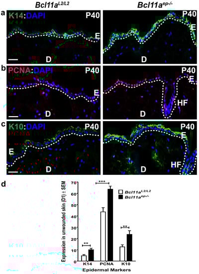 Conditional ablation of Bcl11a in adult epidermis leads to enhanced expression of key epidermal proliferation and differentiation markers in normal skin. (a–c) IHC of P40 dorsal skin sections with basal keratinocyte marker K14 (green), active proliferation marker PCNA (red) and early differentiation marker K10 (green) in Bcl11aL2/L2 versus Bcl11aep−/− mice. All 5 μm-thick paraffin sections were counterstained with DAPI (blue). White dotted lines separate E from D and outline the HFs. D, dermis; E, epidermis; HF, Hair follicle. Scale bar = 50 μm. (d) Bar graph quantification of baseline expression of epidermal markers (K14, PCNA, K10) in P40 Bcl11aL2/L2 versus Bcl11aep−/− skin. N = 2, where N represents the number of animals of each genotype (Bcl11aL2/L2 or Bcl11aep−/−) being involved in the study. 10–12 field of views (FOVs) captured per sample per genotype to determine the statistical significance. ** p < 0.01, *** p < 0.001.