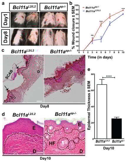 We further evaluated the influence of epidermal Bcl11a ablation on the activation, re-epithelialization and contraction phase of healing at Days 8 and 10 post wounding.
