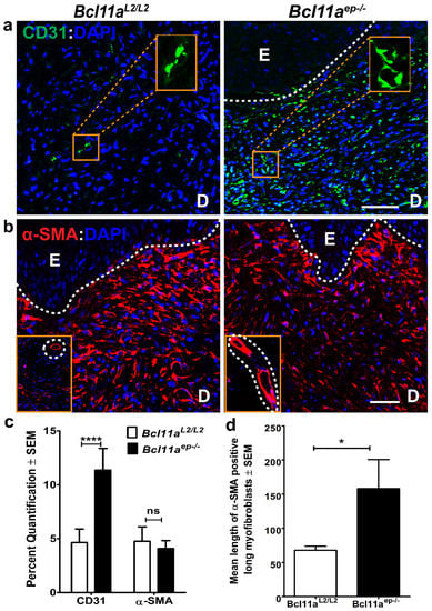 Neovascularization or angiogenesis is critical for wound healing to restore the vascular perfusion to the denuded area and thereby enable formation of the granulation tissue [15]. Immunohistochemical characterization of the expression of CD31 [31], an endothelial cell marker in Bcl11aL2/L2 mice, showed dispersed presence of individual endothelial cells in the Day 8 wound bed, indicating their initial recruitment. In contrast, the abundance and size of blood vessels was significantly increased in the Bcl11aep−/− mice (Figure 6a,c), which signified advanced angiogenesis.