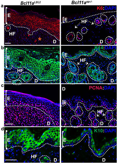 The following supporting information can be downloaded at: https://www.mdpi.com/article/10.3390/cells11132106/s1, Figure S1: Immunoblot analyses of K14, PCNA, and K10 expression in P39 tail skin epidermal protein extracts; Figure S2: Immunoblot analyses of BCL11A targets (FOSL2 and ELOVL4) in P34 tail skin epidermal protein extracts.; Table S1: List of primers used for genotyping; Table S2: List of antibodies used for immunoblotting (IB); Table S3: List of antibodies used for immunohistochemistry (IHC).