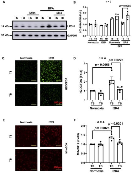 Many studies have uncovered the role of ROS in cardiac I/R injury, which shows ROS is an important contributor to I/R injury, especially mitochondrial ROS []. Limiting the generation of ROS can reduce infarct size and cardiac I/R injury []. Therefore, we examined the ROS levels in NRVMs subjected to I/R (sI/R, 2 h of ischemia and 4 h of reperfusion) injury with TS or TB treatments at the time of reperfusion. We used H2DCFDA and MitoSOX staining to quantify cellular and mitochondrial ROS levels in cardiomyocytes by microscopy. Cytosolic ROS levels after I/R were significantly increased in the TS-treated control group, while the ROS levels were reduced significantly in the TB-treated group (Figure 1C,D). Similar results were observed in the mitochondrial ROS levels measured by mitoSOX (Figure 1E,F). In aggregate, these data indicate that during I/R injury, TB treatment in NRVMs increases autophagic flux and suppresses I/R-induced damaging cytosolic ROS levels.