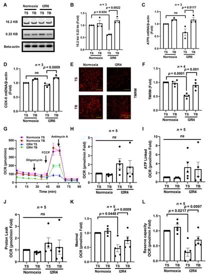 Analyses of cellular bioenergetics were performed using the Seahorse XFe96 Extracellular Flux Analyzer (Agilent, Santa Clara, CA, USA) [,]. After isolation, the NRVMs were plated into an Agilent Seahorse XF96 cell culture microplate (Product No.101085-004) at 28,000 cells/well for 4 days. On the day of the experiment, the cells were exposed to 2 h of ischemia as described above, then 2.5 µM TS/TB was added for a 4-hour reperfusion. After IR or normoxia, the cells were changed into the XF media (nonbuffered DMEM supplemented with 5.5 mM glucose, 1 mM pyruvate, and 4 mM glutamine, pH 7.36) at 37 °C. Oxygen consumption rate (OCR) was measured for basal OCR (OCR before oligomycin minus OCR after antimycin) followed by sequential injections of 1 µg/mL oligomycin, 1 µM FCCP, and 10 µM antimycin A. Mitochondrial parameters were calculated for ATP-linked (OCR before oligomycin minus OCR after oligomycin), proton leak (OCR after oligomycin minus OCR after antimycin), maximal (OCR after FCCP minus OCR after antimycin), reserve capacity (OCR after FCCP minus OCR before oligomycin), and nonmitochondrial (OCR after antimycin).