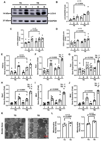 Next, we evaluated the effect of TB on mitochondrial biogenesis and fission- and fusion-related gene expression in the mouse heart subjected to I/R injury. PGC1α gene expression in the border zone of the TB group was significantly increased compared to the TS group, indicating possible increased PGC1α-mediated mitochondrial biogenesis (Figure 3E). Since mitochondrial homeostasis is a dynamic process involving mitochondrial fission and fusion [], we then measured the expression of mitochondrial dynamic genes. In the infarct border zone of the mouse heart with I/R injury, the expression of mitochondrial fission gene, Drp1 (Figure 3F), and fusion genes Opa1, Mfn1, and Mfn2 (Figure 3H–J) were significantly induced in the TB group than the TS group. The fission gene, Fis1, had a trend of increase but did not reach statistical significance in the TB group. These indicated that TB increased mitochondrial dynamics in the mouse heart border zone subjected to I/R injury. We had reported that SAHA treatment increases autophagosomes in rabbits and increases mitochondrial size in the mouse heart border zone using EM [,]. Similarly, we observed an increase in autophagosomes in the TB-treated group than in the TS group in the border zone, with autophagosomes engulfing damaged mitochondria in EM images (Figure S2B). TB also increased the mitochondrial size in the mouse heart infarct border zone (Figure 3K,L). The mitochondrial sizes in the ischemic and remote zones were not significantly different (Figure S2A). Collectively, these results indicate that TB treatment maintained mitochondrial homeostasis in the border zone in mouse hearts during I/R injury.