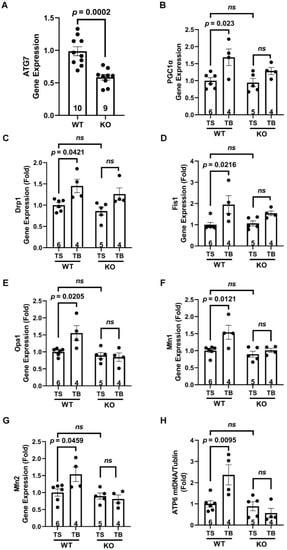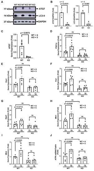 Inducible cardiomyocyte-specific ATG7 knockout mice (αMHC-merCremer+; ATG7F/F treated with tamoxifen, ATG7 cKO (KO)) were generated as described before [], and the loss of ATG7 was verified both by Western blots and qRT-PCR in isolated AMVMs (Figure 4A–C). The loss of ATG7 essentially abolished autophagic flux as shown in the LC3 Western blot (Figure 4A). ATG7F/F treated with tamoxifen injection were used as wild-type (WT) control. At baseline condition, TB increased PGC1α gene expression in WT cardiomyocytes up to 70% (Figure 4D). To see the effects of autophagic flux induced by TB on mitochondrial dynamics, we assessed the expressions of five genes, Drp1 and Fis1, which are associated with mitochondrial fission, and Opa1, Mfn1, and Mfn2, which are associated with fusion. Similar to the expression of PGC1α, TB treatment significantly increased the expression of Drp1, Fis1, Mfn1, and Mfn2 (Figure 5H,I). The fusion gene, Opa1, had a trend of increase but did not reach statistical significance in the WT group. Together, these data showed that TB treatment induces PGC1α expression and promotes mitochondrial dynamic gene expressions in AMVMs.