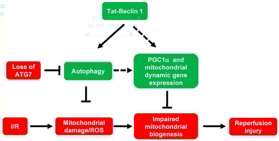 Directly activated autophagic flux by a novel and powerful autophagy-inducing peptide, Tat-Beclin 1, reduces I/R-induced ROS levels and maintains mitochondrial homeostasis during cardiac I/R injury. Induction of autophagic flux also augments PGC1α expression, therefore regulating mitochondrial biogenesis in adult cardiomyocytes. Furthermore, induction of autophagic flux increased most of the mitochondrial fission and fusion gene expression, indicating possible increased mitochondrial dynamics. Additionally, these protective effects are dependent on the essential autophagy-related gene, ATG7, in adult cardiomyocytes (Figure 6). Maintaining appropriate activation of autophagic flux and mitochondrial biogenesis by Tat-Beclin 1 or other agents may be used in future myocardial protection clinical trials in ST-elevation myocardial infarction patients.