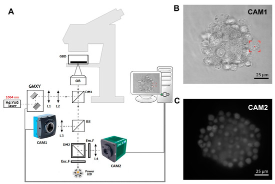(A) In-house-developed fluorescence optical tweezers (FOT). L1, …, L4—lenses; DM1, DM2—dichroic mirrors; BS—beam splitter; GMXY—Galvano-mirror XY scanning system; OB—high NA numerical aperture objective; Exc.F—excitation filter; Em.F—emission filter; CAM1, CAM2—digital cameras 1 and 2. (B) The image of a hybrid spheroid taken in the brightfield by CAM1. The red box represents the optical trap. (C) The fluorescent image of a hybrid spheroid was taken by CAM2.