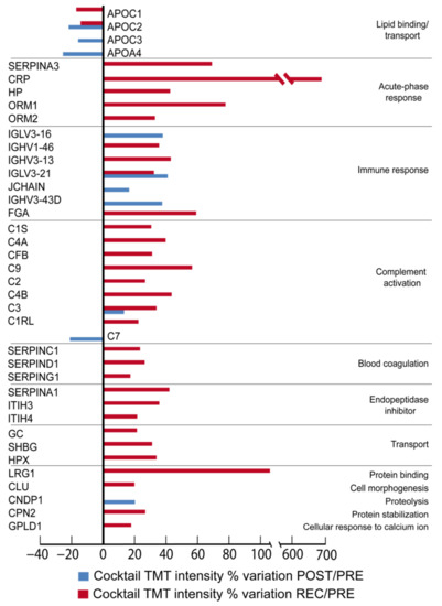 TMT LC-MS/MS proteomic analysis results from sera samples of cocktail-treated BR group. Differential abundant proteins are expressed as histograms representing their intensity as a percentage of variation from PRE. Blue bars represent variation identified in the POST/PRE, while red bars are alterations identified in the REC/PRE comparison. One-way repeated measures ANOVA and Tukey’s test, n = 5, p-value < 0.05.