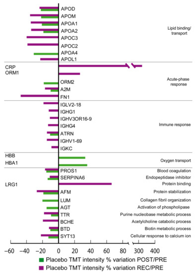 TMT LC-MS/MS proteomic analysis results from sera sample of placebo-treated BR group. Differential abundant proteins are expressed as histograms representing their intensity as a percentage of variation from PRE. Green bars represent variation identified in the POST/PRE, while purple bars represent alterations identified in the REC/PRE comparison. (One-way repeated measures ANOVA and Tukey’s test, n = 5, p-value < 0.05).