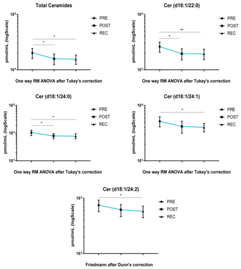 Upon cocktail treatment, total ceramide and Cer acyl chains d18:1/22 and d18:1/24:0 decreased after BR, both in POST vs. PRE and REC vs. PRE. Ceramide acyl chains d18:1/24:1 and d18:1/24:2 decreased in REC vs. PRE comparison (Figure 3).