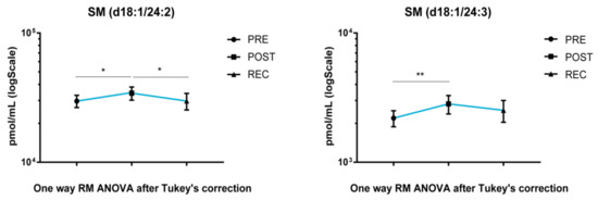 LC-MS analysis results for sphingomyelins in cocktail-treated subjects’ serum. Results are expressed as pmol/mL in Log scale (PRE n. 10, POST n. 10, REC n. 10). p-values are indicated as: * p-value < 0.05 and ** p-value < 0.01.