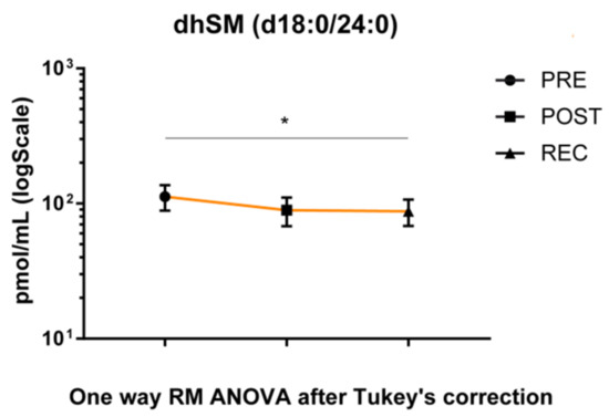 The dhSM’s acyl chain d18:0/24:0 was the only species with a statistically significant change in the placebo group during BR, decreasing in the REC vs. PRE comparison (Figure 5).