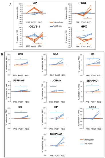 Results from iodoTMT LC-MS/MS proteomic analysis of placebo-treated subjects. Differentially abundant proteins from TMT and iodoTMT analyses are expressed as a percentage of variation from PRE. Blue lines refer to total protein, while orange lines to protein S-Nitrosylation. Significant alterations in protein S-nitrosylation (A) and significant alteration in total protein levels (B). Protein S-nitrosylation levels in (B) are normalized to 0% for graphical comparison. (One-way repeated measures ANOVA and Tukey’s test, n = 5, * p-value < 0.05).