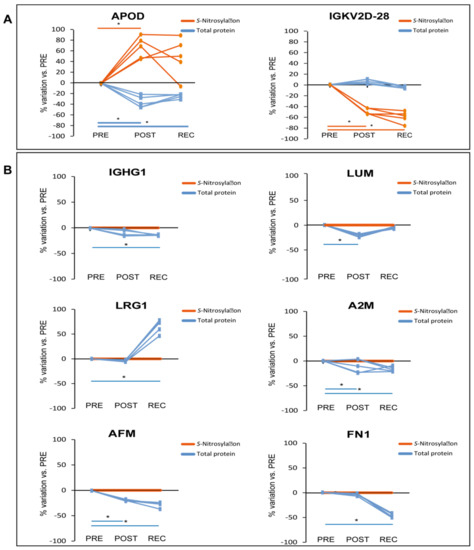 APOD was the only one that decreased its level while its S-nitrosylation increased with statistical significance. In the placebo group (Figure 7B), total protein level of A2M and AFM decreased in REC/PRE and POST/PRE, LUM decreased in POST/PRE whereas IGHG1 and FN1 decreased in REC/PRE. LRG1, similarly to cocktail-treated group, was the only protein increased in REC/PRE, indicating a decreased S-NO/total protein ratio also found in several other serum proteins from the cocktail BR group.