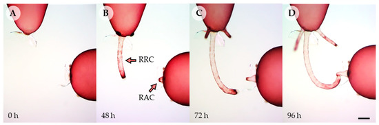 Induced elongation and somatic fusion of repair cells in Griffithsia monilis. (A) After removal of dead cell debris, two adjacent cells were placed close to each other. (B) Repair rhizoidal cell and repair apical cell were generated and extended from upper and lower adjacent cells, respectively. (C) The first repair rhizoidal cell began to bend towards the repair apical cell. The second and third repair rhizoidal cell formed from the upper adjacent cell began to elongate. (D) Somatic fusion occurred at the ends of the two repair cells. RRC; repair rhizoidal cell, RAC; repair apical cell. Scale bar: 200 µm.