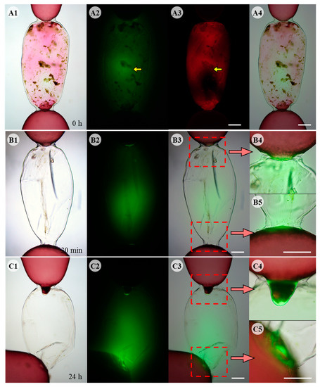 Green fluorescence of ROS was observed by DCFH-DA staining in cells killed by physical damage (Figure 2A). ROS appeared to be released from the debris of degenerating intracellular organelles and was distinct from other autofluorescence in the cytoplasm (Figure 2(A2,A3), yellow arrows). ROS production in the adjacent cells was observed after removing the debris inside the dead cells (Figure 2B1). ROS were detected in the upper and lower adjacent cells facing the dead cell (Figure 2(B4,B5)), and also accumulated in the empty space of the dead cell 30 min post wounding (Figure 2B2). When adjacent cells produced repair cells, ROS production was confined to the repair cells (Figure 2C) and strong fluorescence was detected in the area close to repair apical cell (Figure 2C2). The strongest fluorescence was observed at the apical end of repair cells (Figure 2(C4,C5)).