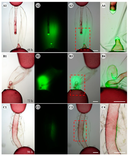 Fluorescent DCFH-DA staining during wound healing in Griffithsia monilis. 1st column shows light microscope images, 2nd column shows DCFH-DA fluorescence image of the same cell, 3rd column shows the merged images, and 4th column shows enlarged image of dashed box in 3rd column. (A1) Light microscope image showing repair cells growing towards each other. (A2) DCFH-DA staining image of the same cell showing ROS production at the tip of each repair cell and strong fluorescence between the two repair cells. (A3) Merged image of (A1,A2). (A4) Enlarged image of the dashed box in (A3). (B1) Light microscope image of repair cells just before somatic fusion. Repair apical cell bent towards repair rhizoidal cell. (B2) DCFH-DA staining showing strong fluorescence in the contact area around the two repair cells. (B3) Merged image. (B4) Enlarged image of dashed box. The two repair cells are in contact with each other, but somatic fusion does not occur until the distal ends of each other are in contact. (C1) Light microscope image of fused cell. (C2) DCFH-DA staining disappeared except for faint fluorescence around fusion area. (C3) Merged image. (C4) Enlarged image of dashed box. Scale bars: 200 µm.