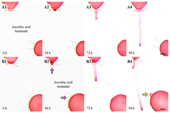Wound healing with ascorbic acid treatment. (A1–A4) Repair apical cell was not produced even by 96 h. Repair rhizoidal cells developed later than control and was not attracted to lower cell. (B1–B4) When ascorbic acid was treated after the development of repair cells (48 h, red arrow), repair cells are not attracted towards each other. Yellow arrow points normal cell not involved in fusion, not repair cell. Scale bars: 200 µm.