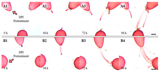 Wound healing with pretreatment of DPI for 30 min. After placing DPI-pretreated cells and non-treated cells close to the complementary repair cells, the attraction between the repair cells was observed. (A1–A4) When one of the upper cells was pretreated with DPI only the repair rhizoidal cells formed from untreated cells were attracted towards and fuse with repair apical cell. (B1–B4) When one of the lower adjacent cells was pretreated with DPI, the repair rhizoidal cell was attracted only towards untreated repair apical cell. Scale bars: 200 µm.