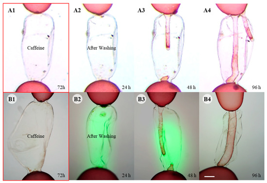 Wound healing with caffeine treatment. (A1). No repair cell was formed in caffeine treatment for 72 h. (A2–A4) Wound healing resumed after washing out the caffeine and somatic cell fusion occurred in 96 h after washing. (B1) DCFH-DA staining shows no fluorescence in caffeine treated cells for 72 h. (B2) Fluorescence was detected in 24 h after caffeine was washed out. (B3) Repair cells developed within 48 h after washing out caffeine, and strong fluorescence was detected at the tip of the elongated repair cells. (B4) Somatic cell fusion occurred in 96 h after washing out caffeine. No fluorescence was detected at this time. Scale bar: 200 µm.