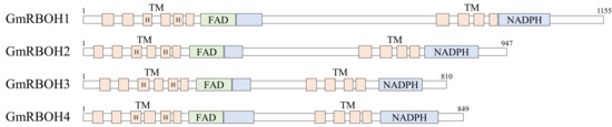 Functional domains of four GmRBOH genes (1, 2, 3, 4) identified in Griffithsia monilis. The number and order of domains are similar among GmRBOHs.