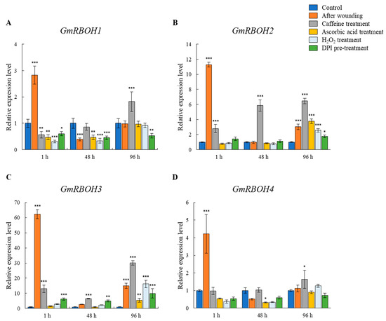 Quantitative PCR analysis showed that the expression of GmRBOHs was highly upregulated by the wounding and gradually reduced during wound healing (Figure 8, Orange bars). This expression pattern was observed in all GmRBOHs, but the fold change in expression varied from >3 to >62. The expression of GmRBOH2 and GmRBOH3 increased most significantly, between >11.3 and >62.3, respectively (Figure 8B,C). When the plants were treated with 5 mM caffeine, the expression of GmRBOHs was initially lower than that of the wounded plants, 1 h after wounding, but gradually increased over time to be higher than that of the wounded plants (Figure 8, grey bars). In the treatment with 0.5 mM ascorbic acid and 50 μM H2O2, wounding of plants did not induce upregulation of any GmRBOHs (Figure 8, yellow and pale blue bars, respectively). When plants were preincubated in 10 μM DPI for 30 min before wounding, the expression of GmRBOHs was not upregulated upon wounding and did not recover over time (Figure 8, green bars).