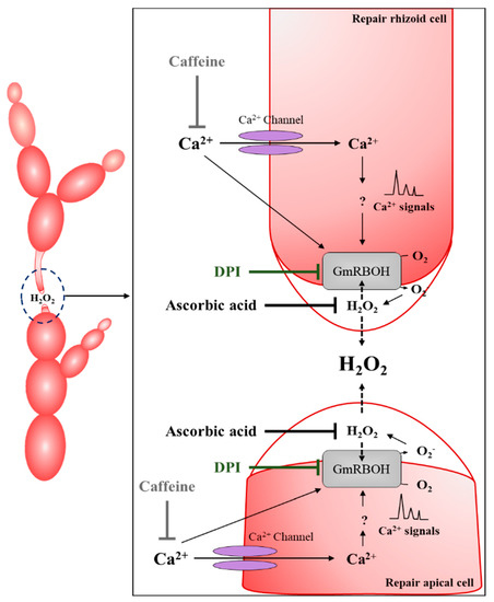 Our results showed that a calcium-mediated ROS signal regulates the wound healing response in Griffithsia monilis, from generation and elongation of the repair cells to the fusion process. Early wound recognition by adjacent cells appears to be triggered by ROS released from degenerating dead cells because the wound response did not initiate when cells were treated with a ROS scavenger. After this step, ROS production appears to be driven by NADPH-oxidases localized to adjacent cells as well as repair cells involved in wound healing since ROS generation stopped with treatment of DPI or caffeine, inhibitors of NADPH-oxidase (Figure 9). The production, local concentration, and exposure time of ROS needs to be tightly controlled, as it can be involved in multiple intracellular reactions and may lead to a variety of toxic responses [45]. Our results showed that ROS generation was mostly restricted to adjacent cells facing the dead cells, and shifted to the developing repair cells, and then to their elongated tips. ROS are released from these cell regions into the extracellular space as H2O2 and ROS generation stopped as soon as somatic cell fusion occurred. A positive feedback loop of H2O2 and NADPH-oxidase activity was observed. Ascorbic acid treatment not only eliminates the released H2O2 and interferes with signal transduction, but also inhibits the expression of the NADPH-oxidase gene in the early stages of wound healing (Figure 9). Quantitative PCR results also showed that expression of GmRBOHs was inhibited when NADPH-oxidase was inactivated by DPI or caffeine treatment. Hydrogen peroxide appears to be a direct signal that induces cellular changes. H2O2 treatment induced numerous repair cells in the area, the subapical region of lower adjacent cells, where they are not normally produced.