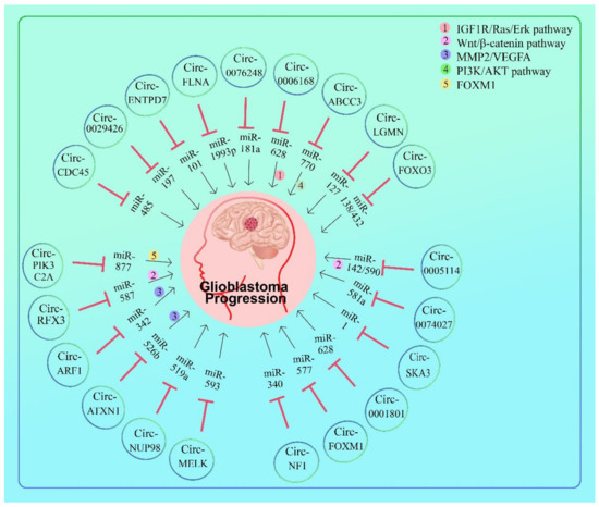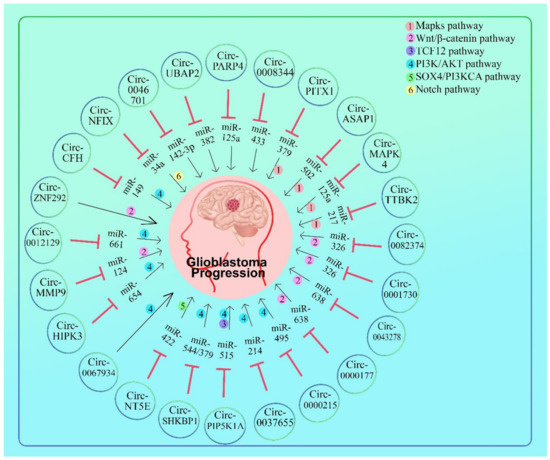 | 5 | Circ-AKT3 | PI3K/AKT pathway | Downregulated | [113] | |