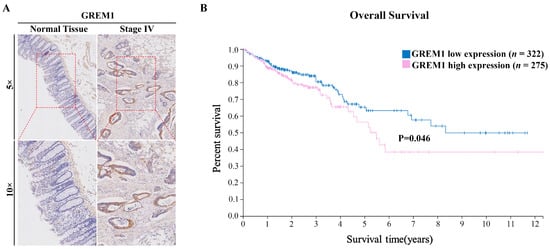 To investigate the clinical relevance of GREM1 in CRC, we first stained patient specimens to determine GREM1 expression via IHC. Compared with normal tissues, GREM1 was significantly upregulated in tumor tissues (Figure 1A). Moreover, RNA-seq of the CRC dataset in the Human Protein ATLAS (https://www.proteinatlas.org/ accessed on 30 April 2022) showed that GREM1 overexpression was significantly associated with poor overall survival (OS). The Kaplan–Meier plots were generated as per the best cutoff value of 5.31, suggesting that a level of GREM1 expression (FPKM) lower than 5.31 was defined as “Low”, otherwise as “High”(p = 0.046; Figure 1B). Thus, by distinguishing high vs. low expression of GREM1, we found that the corresponding survival curves between the two groups were separated significantly. These findings suggest that GREM1 may be associated with human CRC progression.