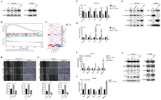 Further, to investigate the changes in migration and invasion capacity upon GREM1 overexpression or underexpression, we performed wound healing assays which showed that GREM1-overexpressing CRC cells migrated markedly faster than control cells, in keeping with the results of the invasion assays. Meanwhile, knockdown of GREM1 by GREM1-specific shRNA reduced the invasion and migration of HCT116 and SW480 cells (Figure 2D,E). All these results indicated that GREM1 promoted migration and invasion of CRC cells. We postulated that these cellular phenotypes might be attributed to EMT and ER stress presented in our aforementioned transriptomic signature. Consistently, expression of canonical EMT factors ZEB1, Vimentin, Snail and ZO-1 were significantly upregulated, and expression of E-cadherin was markedly downregulated at both the mRNA (Figure 2F,G) and the protein levels (Figure 2H) in GREM1-overexpressing CRC cells. Previous studies have shown that EMT in a variety of tumor cells is inextricably linked to the activation of ERS, which could be seen in our study that the canonical ER stress chaperone and sensors Bip, ATF6 and IRE1a were upregulated whilst ATF4 was downregulated at the mRNA and protein expression levels in GREM1-overexpressing HCT116 and SW480 cells (Figure 2I–K). Taken together, these results indicate that GREM1 promotes EMT and regulates ER stress signaling in CRC cells.